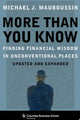 More Than You Know is written with the professional investor in mind but extends far beyond the world of economics and finance. Mauboussin groups his essays into four partsβInvestment Philosophy, Psychology of Investing, Innovation and Competitive Strategy, and Science and Complexity Theoryβand he includes substantial references for further reading. A true eye-opener, More Than You Know shows how a multidisciplinary approach that pays close attention to process and the psychology of decision making offers the best chance for long-term financial results.